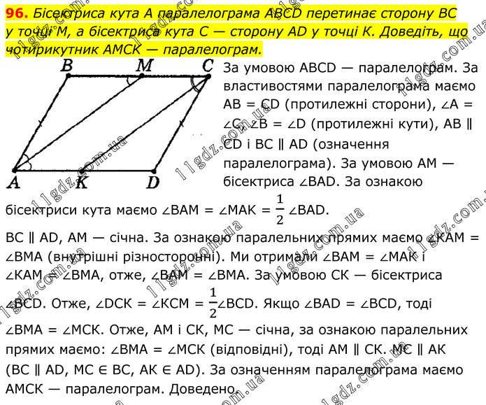 96. Бісектриса кута А паралелограма ABCD перетинає сторону BC у точці M, а бісектриса кута C — сторону AD у точці К. Доведіть, що чотирикутник AMCK — паралелограм. За умовою АВСD — паралелограм. За властивостями паралелограма маємо АВ = СD (протилежні сторони), ∠А = ∠С, ∠В = ∠D (протилежні кути), АВ ∥ СD і ВС ∥ АD (означення паралелограма). За умовою АМ — бісектриса ∠ВАD. За ознакою бісектриси кута маємо ∠BAM = ∠MAK = 1/2 ∠BAD. ВС ∥ АD, АМ — січна. За ознакою паралельних прямих маємо ∠КАМ = ∠ВМА (внутрішні різносторонні). Ми отримали ∠ВАМ = ∠МАК і ∠КАМ = ∠ВМА, отже, ∠ВАМ = ∠ВМА. За умовою СК — бісектриса ∠ВСD. Отже, ∠DСК = ∠КСМ = 1/2∠ВСD. Якщо ∠ВАD = ∠ВСD, тоді ∠ВМА = ∠МСК. Отже, АМ і СК, МС — січна, за ознакою паралельних прямих маємо: ∠ВМА = ∠МСК (відповідні), тоді АМ ∥ СК. МС ∥ АК (ВС ∥ АD, МС ∈ ВС, АК ∈ АD). За означенням паралелограма маємо АМСК — паралелограм. Доведено.