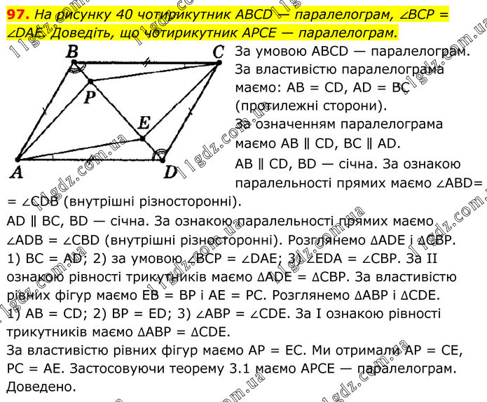 97. На рисунку 40 чотирикутник ABCD — паралелограм, ∠BCP = ∠DAE. Доведіть, що чотирикутник APCE — паралелограм. За умовою АВСD — паралелограм. За властивістю паралелограма маємо: АВ = СD, АD = ВС (протилежні сторони). За означенням паралелограма маємо АВ ∥ СD, ВС ∥ АD. АВ ∥ СD, ВD — січна. За ознакою паралельності прямих маємо ∠АВD= = ∠СDВ (внутрішні різносторонні). АD ∥ ВС, ВD — січна. За ознакою паралельності прямих маємо ∠АDВ = ∠СВD (внутрішні різносторонні). Розглянемо ∆АDЕ і ∆СВР. 1) ВС = АD; 2) за умовою ∠ВСР = ∠DАЕ; 3) ∠ЕDА = ∠СВР. За II ознакою рівності трикутників маємо ∆АDЕ = ∆СВР. За властивістю рівних фігур маємо ЕВ = ВР і АЕ = РС. Розглянемо ∆АВР і ∆СDЕ. 1) АВ = СD; 2) ВР = ЕD; 3) ∠АВР = ∠СDЕ. За І ознакою рівності трикутників маємо ∆АВР = ∆CDE. За властивістю рівних фігур маємо АР = ЕС. Ми отримали АР = СЕ, РС = АЕ. Застосовуючи теорему 3.1 маємо АРСЕ — паралелограм. Доведено.