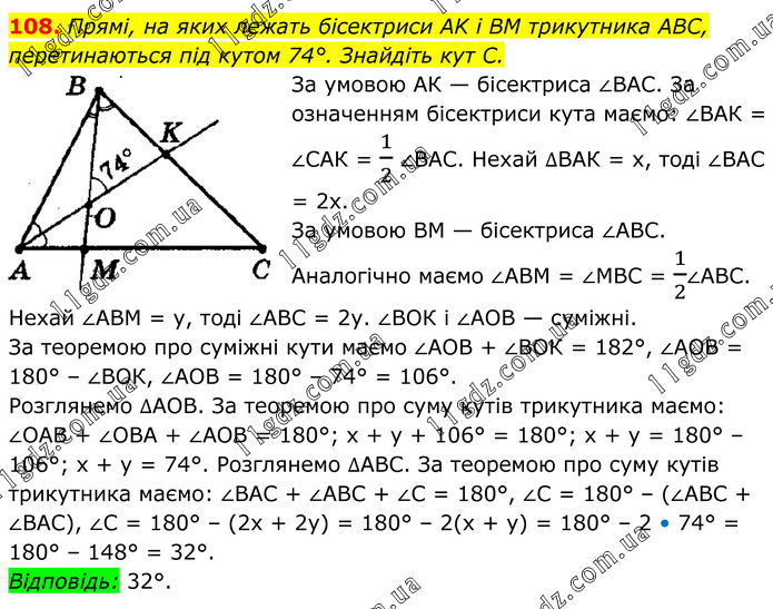 108. Прямі, на яких лежать бісектриси AK і BM трикутника ABC, перетинаються під кутом 74°. Знайдіть кут С. За умовою АК — бісектриса ∠ВАС. За означенням бісектриси кута маємо: ∠ВАК = ∠САК = 1/2 ∠ВАС. Нехай ∆ВАК = х, тоді ∠ВАС = 2х. За умовою ВМ — бісектриса ∠АВС. Аналогічно маємо ∠АВМ = ∠МВС = 1/2∠AВС. Нехай ∠АВМ = у, тоді ∠АВС = 2у. ∠ВОК і ∠АОВ — суміжні. За теоремою про суміжні кути маємо ∠АОВ + ∠ВОК = 182°, ∠АОВ = 180° – ∠ВОК, ∠АОВ = 180° – 74° = 106°. Розглянемо ∆АОВ. За теоремою про суму кутів трикутника маємо: ∠ОАВ + ∠ОВА + ∠АОВ = 180°; х + у + 106° = 180°; х + у = 180° – 106°; х + у = 74°. Розглянемо ∆АВС. За теоремою про суму кутів трикутника маємо: ∠ВАС + ∠АВС + ∠С = 180°, ∠С = 180° – (∠АВС + ∠ВАС), ∠С = 180° – (2х + 2у) = 180° – 2(х + у) = 180° – 2 • 74° = 180° – 148° = 32°. Відповідь: 32°.