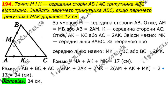 194. Точки M i K — середини сторін AB і AC трикутника ABC відповідно. Знайдіть периметр трикутника ABC, якщо периметр трикутника МАК дорівнює 17 см. За умовою М — середина сторони АВ. Отже, АМ = МВ або АВ = 2АМ. К — середина сторони АС. Отже, АК = КС або АС = 2АК. Звідси маємо: МК — середня лінія ∆АВС. За теоремою про середню лінію маємо: МК = 1/2ВС або ВС = 2МК. Р∆MAK = МА + АК + МК = 17 (см). Р∆АВС = АВ + ВС + АС = 2АМ + 2АК + 2МК = 2(АМ + АК + МК) = 2 • 17 = 34 (см). Відповідь: 34 см.