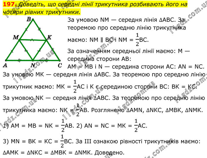 197. Доведіть, що середні лінії трикутника розбивають його на чотири рівних трикутники. 3а умовою NМ — середня лінія ∆АВС. За теоремою про середню лінію трикутника маємо: NМ ∥ ВС і NМ = 1/2ВС. За означенням середньої лінії маємо: М — середина сторони АВ: АМ = МВ і N — середина сторони АС: АN = NC. За умовою МК — середня лінія ∆АВС. За теоремою про середню лінію трикутник маємо: МК = 1/2АС і К є серединою сторони ВС: ВК = КС. За умовою NК — середня лінія ∆АВС. За теоремою про середню лінію трикутника маємо: NК = 1/2АВ. Розглянемо ∆АМN, ∆NКС, ∆МВК, ∆NМК. 1) АМ = МВ = NК = 1/2АВ. 2) АN = NС = МК = 1/2АС. 3) МN = ВК = КС = 1/2ВС. За III ознакою рівності трикутників маємо: ∆АМК = ∆NКС = ∆МВК = ∆NМК. Доведено.