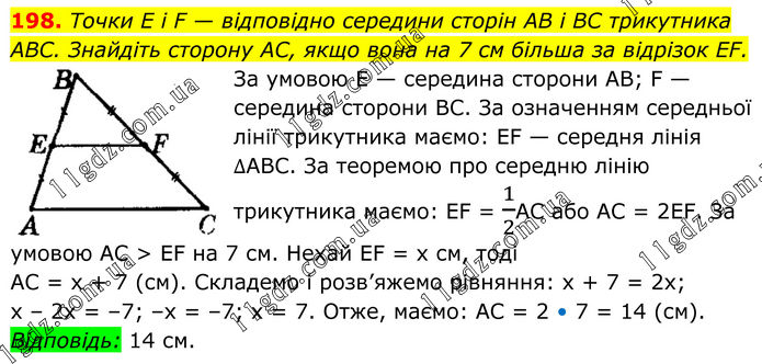 198. Точки E i F — відповідно середини сторін AB і BC трикутника ABC. Знайдіть сторону AC, якщо вона на 7 см більша за відрізок EF. За умовою Е — середина сторони АВ; F — середина сторони ВС. За означенням середньої лінії трикутника маємо: ЕF — середня лінія ∆АВС. За теоремою про середню лінію трикутника маємо: ЕF = 1/2АС або АС = 2EF. За умовою АС > EF на 7 см. Нехай EF = х см, тоді АС = х + 7 (см). Складемо і розв’яжемо рівняння: x + 7 = 2x; x – 2х = –7; –х = –7; x = 7. Отже, маємо: АС = 2 • 7 = 14 (см). Відповідь: 14 см.