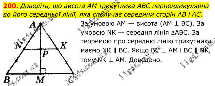 200. Доведіть, що висота AM трикутника ABC перпендикулярна до його середньої лінії, яка сполучає середини сторін AB і AC. За умовою АМ — висота (АМ ⊥ ВС). За умовою NК — середня лінія ∆АВС. За теоремою про середню лінію трикутника маємо NК ∥ ВС. Якщо ВС ⊥ АМ і ВС ∥ NК, тому NК ⊥ АМ. Доведено.