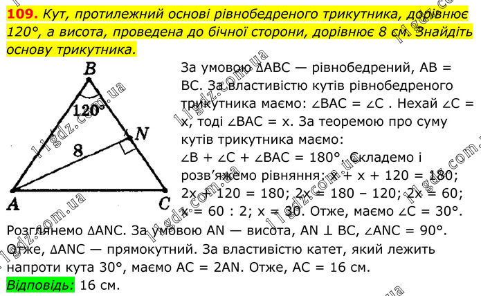 109. Кут, протилежний основі рівнобедреного трикутника, дорівнює 120°, а висота, проведена до бічної сторони, дорівнює 8 см. Знайдіть основу трикутника. За умовою ∆АВС — рівнобедрений, АВ = ВС. За властивістю кутів рівнобедреного трикутника маємо: ∠ВАС = ∠С . Нехай ∠С = х, тоді ∠ВАС = х. За теоремою про суму кутів трикутника маємо: ∠В + ∠С + ∠ВАС = 180°. Складемо і розв’яжемо рівняння: х + х + 120 = 180; 2х + 120 = 180; 2х = 180 – 120; 2х = 60; x = 60 : 2; x = 30. Отже, маємо ∠С = 30°. Розглянемо ∆ANC. За умовою AN — висота, AN ⊥ ВС, ∠ANC = 90°. Отже, ∆ANC — прямокутний. За властивістю катет, який лежить напроти кута 30°, маємо АС = 2AN. Отже, АС = 16 см. Відповідь: 16 см.