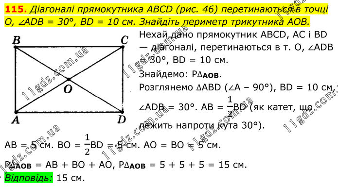 115. Діагоналі прямокутника ABCD (рис. 46) перетинаються в точці О, ∠ADB = 30°, BD = 10 см. Знайдіть периметр трикутника AOВ. Нехай дано прямокутник ABCD, АС і BD — діагоналі, перетинаються в т. О, ∠ADB = 30°, BD = 10 см. Знайдемо: P∆AOB. Розглянемо ∆ABD (∠А – 90°), BD = 10 см, ∠ADB = 30°. АВ = 1/2BD (як катет, що лежить напроти кута 30°). АВ = 5 см. BO = 1/2BD = 5 cм. АО = ВО = 5 см. P∆AOB = АВ + ВО + АО, P∆AOB = 5 + 5 + 5 = 15 см. Відповідь: 15 см.