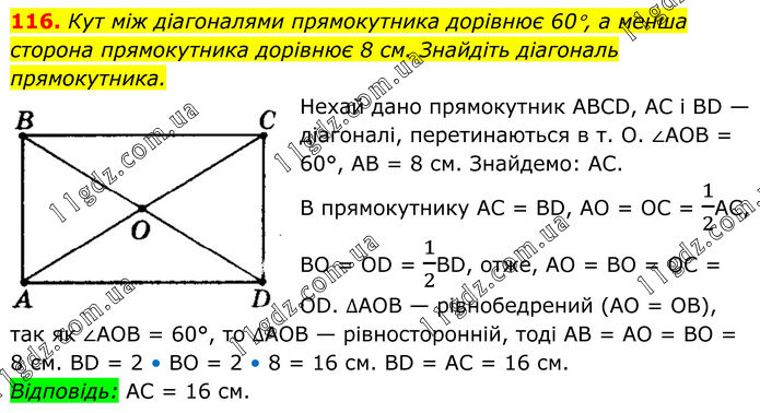 116. Кут між діагоналями прямокутника дорівнює 60°, а менша сторона прямокутника дорівнює 8 см. Знайдіть діагональ прямокутника. Нехай дано прямокутник АВСD, АС і ВD — діагоналі, перетинаються в т. О. ∠АОВ = 60°, АВ = 8 см. Знайдемо: АС. В прямокутнику АС = BD, АО = ОС = 1/2АС, ВО = OD = 1/2BD, отже, АО = ВО = ОС = OD. ∆АОВ — рівнобедрений (АО = ОВ), так як ∠АОВ = 60°, то ∆АОВ — рівносторонній, тоді АВ = АО = ВО = 8 см. BD = 2 • ВО = 2 • 8 = 16 см. BD = АС = 16 см. Відповідь: АС = 16 см.