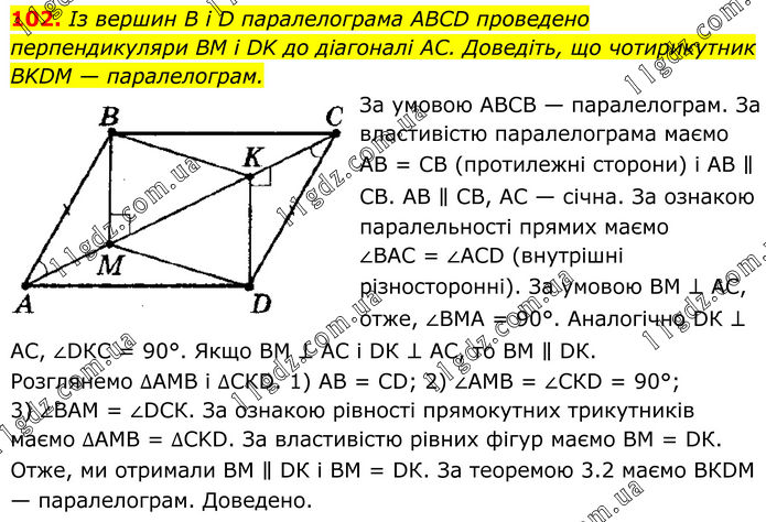 102. Із вершин B i D паралелограма ABCD проведено перпендикуляри BM і DK до діагоналі AC. Доведіть, що чотирикутник BKDM — паралелограм. За умовою АВСВ — паралелограм. За властивістю паралелограма маємо АВ = СВ (протилежні сторони) і АВ ∥ СВ. АВ ∥ СВ, АС — січна. За ознакою паралельності прямих маємо ∠ВАС = ∠АСD (внутрішні різносторонні). За умовою ВМ ⊥ АС, отже, ∠ВМА = 90°. Аналогічно DК ⊥ АС, ∠DКС = 90°. Якщо ВМ ⊥ АС і DК ⊥ АС, то ВМ ∥ DК. Розглянемо ∆АМВ і ∆СКD. 1) АВ = СD; 2) ∠АМВ = ∠СКD = 90°; 3) ∠ВАМ = ∠DСК. За ознакою рівності прямокутних трикутників маємо ∆АМВ = ∆CKD. За властивістю рівних фігур маємо ВМ = DК. Отже, ми отримали ВМ ∥ DК і ВМ = DК. За теоремою 3.2 маємо ВКDМ — паралелограм. Доведено.
