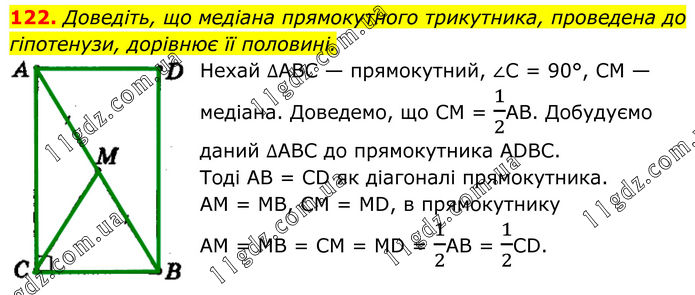 122. Доведіть, що медіана прямокутного трикутника, проведена до гіпотенузи, дорівнює її половині. Нехай ∆АВС — прямокутний, ∠С = 90°, СМ — медіана. Доведемо, що СМ = 1/2АВ. Добудуємо даний ∆АВС до прямокутника АDВС. Тоді АВ = СD як діагоналі прямокутника. АМ = МВ, СМ = МD, в прямокутнику АМ = МВ = СМ = МD = 1/2АВ = 1/2СD.