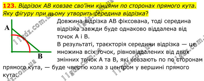 123. Вiдрiзок АВ ковзае сво'їми кiнцями по сторонах прямого кута. Яку фiгуру при цьому утворить середина вiдрiзка? Довжина відрізка AB фіксована, тоді середина відрізка завжди буде однаково віддалена від точок A і B. В результаті, траєкторія середини відрізка — це множина всіх точок, рівновіддалених від двох змінних точок A та B, які ковзають по по сторонам прямого кута, — буде чвертю кола з центром у вершині прямого кута.