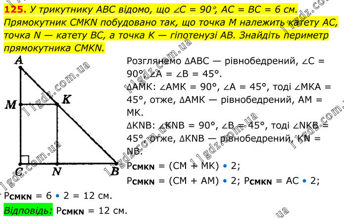 125. У трикутнику ABC відомо, що ∠C = 90°, AC = BC = 6 см. Прямокутник CMKN побудовано так, що точка M належить катету AC, точка N — катету BC, а точка K — гіпотенузі AB. Знайдіть периметр прямокутника CMKN. Розглянемо ∆АВС — рівнобедрений, ∠С = 90°, ∠А = ∠В = 45°. ∆АМК: ∠АМК = 90°, ∠А = 45°, тоді ∠МКА = 45°, отже, ∆АМК — рівнобедрений, АМ = МK. ∆KNB: ∠КNВ = 90°, ∠В = 45°, тоді ∠NKВ = 45°, отже, ∆КNВ — рівнобедрений, KN = NВ. PCMKN = (СМ + MK) • 2; PCMKN = (CM + AM) • 2; PCMKN = AC • 2; PCMKN = 6 • 2 = 12 см. Відповідь: PCMKN = 12 см.