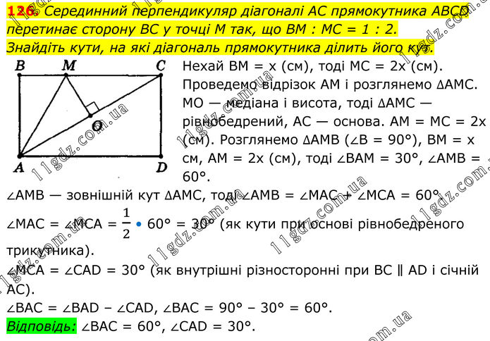 126. Серединний перпендикуляр діагоналі AC прямокутника ABCD перетинає сторону BC у точці M так, що BM : MC = 1 : 2. Знайдіть кути, на які діагональ прямокутника ділить його кут. Нехай ВМ = х (см), тоді МС = 2х (см). Проведемо відрізок АМ і розглянемо ∆АМС. МО — медіана і висота, тоді ∆АМС — рівнобедрений, АС — основа. АМ = МС = 2х (см). Розглянемо ∆АМВ (∠В = 90°), ВМ = х см, АМ = 2х (см), тоді ∠ВАМ = 30°, ∠АМВ = 60°. ∠АМВ — зовнішній кут ∆АМС, тоді ∠АМВ = ∠МАС + ∠МСА = 60°. ∠MAC = ∠MCA = 1/2 • 60° = 30° (як кути при основі рівнобедреного трикутника). ∠МСА = ∠CAD = 30° (як внутрішні різносторонні при ВС ∥ AD і січній АС). ∠ВАС = ∠BAD – ∠CAD, ∠ВАС = 90° – 30° = 60°. Відповідь: ∠ВАС = 60°, ∠CAD = 30°.