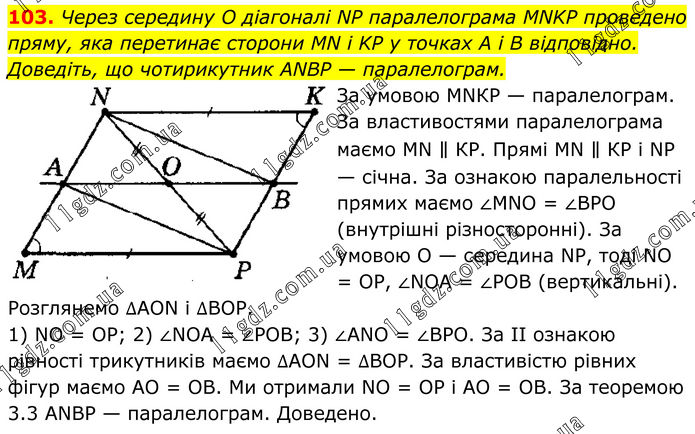 103. Через середину O діагоналі NP паралелограма MNKP проведено пряму, яка перетинає сторони MN і KP у точках A i B відповідно. Доведіть, що чотирикутник ANBP — паралелограм. За умовою МNКР — паралелограм. За властивостями паралелограма маємо МN ∥ КР. Прямі МN ∥ КР і NР — січна. За ознакою паралельності прямих маємо ∠МNО = ∠ВРО (внутрішні різносторонні). За умовою О — середина NР, тоді NO = ОР, ∠NОА = ∠РОВ (вертикальні). Розглянемо ∆АON і ∆ВОР. 1) NO = ОР; 2) ∠NОА = ∠РОB; 3) ∠АNО = ∠ВРО. За II ознакою рівності трикутників маємо ∆АОN = ∆ВОР. За властивістю рівних фігур маємо АО = ОВ. Ми отримали NO = ОР і АО = ОВ. За теоремою 3.3 АNВР — паралелограм. Доведено.