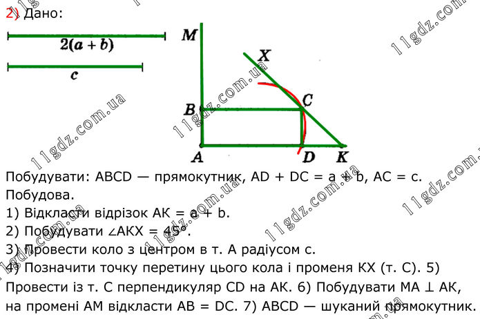 2) Дано: Побудувати: АВСD — прямокутник, AD + DС = а + b, АС = с. Побудова. 1) Відкласти відрізок АК = а + b. 2) Побудувати ∠АКХ = 45°. 3) Провести коло з центром в т. А радіусом с. 4) Позначити точку перетину цього кола і променя КХ (т. С). 5) Провести із т. С перпендикуляр СD на АК. 6) Побудувати МА ⊥ АК, на промені АМ відкласти АВ = DС. 7) АВСD — шуканий прямокутник.
