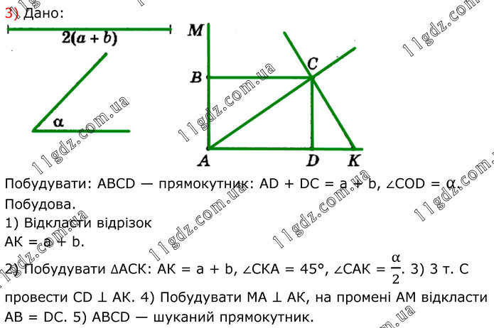 3) Дано: Побудувати: АВСD — прямокутник: AD + DС = а + b, ∠СОD = α. Побудова. 1) Відкласти відрізок АК = а + b. 2) Побудувати ∆АСК: АК = а + b, ∠СКА = 45°, ∠САК = α/2. 3) 3 т. С провести СD ⊥ АК. 4) Побудувати МА ⊥ АК, на промені АМ відкласти АВ = DС. 5) АВСD — шуканий прямокутник.