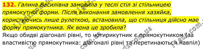 132. Галина Василiвна замовила у теслi стiл зi стiльницею прямокутної форми. Пiсля виконання замовлення хазяйка, користуючись лише рулеткою, встановила, що стiльниця дiйсно мае форму прямокутника. Як вона це зробила? Якщо обидві діагоналі рівні, то чотирикутник є прямокутником (за властивістю прямокутника: діагоналі рівні та перетинаються навпіл)