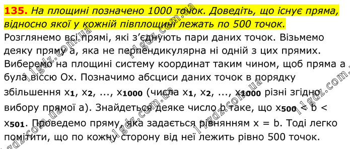 135. На площині позначено 1000 точок. Доведіть, що існує пряма, відносно якої у кожній півплощині лежать по 500 точок. Розглянемо всі прямі, які з’єднують пари даних точок. Візьмемо деяку пряму а, яка не перпендикулярна ні oдній з цих прямих. Виберемо на площині систему координат таким чином, щоб пряма а була віссю Ох. Позначимо абсциси даних точок в порядку збільшення x1, x2, ..., х1000 (числа х1, х2, ..., х1000 різні згідно вибору прямої a). Знайдеться деяке число b таке, що x500 < b < x501. Проведемо пряму, яка задається рівнянням х = b. Тоді легко помітити, що по кожну сторону від неї лежить рівно 500 точок.