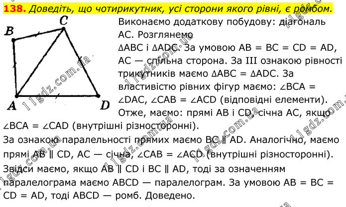 138. Доведіть, що чотирикутник, усі сторони якого рівні, є ромбом. Виконаємо додаткову побудову: діагональ АС. Розглянемо ∆АВС і ∆ADC. За умовою АВ = ВС = CD = AD, AC — спільна сторона. За III ознакою рівності трикутників маємо ∆АВС = ∆ADC. За властивістю рівних фігур маємо: ∠BCA = ∠DAC, ∠CAB = ∠ACD (відповідні елементи). Отже, маємо: прямі АВ і CD, січна АС, якщо ∠BCA = ∠CAD (внутрішні різносторонні). За ознакою паралельності прямих маємо ВС ∥ AD. Аналогічно, маємо прямі АВ ∥ CD, АС — січна, ∠CAB = ∠ACD (внутрішні різносторонні). Звідси маємо, якщо АВ ∥ CD і ВС ∥ AD, тоді за означенням паралелограма маємо ABCD — паралелограм. За умовою АВ = ВС = CD = AD, тоді ABCD — ромб. Доведено.