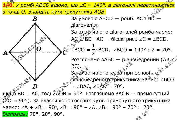 140. У ромбі ABCD відомо, що ∠C = 140°, а діагоналі перетинаються в точці О. Знайдіть кути трикутника AOB. За умовою ABCD — ромб. АС і BD — діагоналі. За властивістю діагоналей ромба маємо: АС ⊥ BD і АС — бісектриса ∠C = ∠BCD. ∠BCO = 1/2∠BCD, ∠BСО = 140° : 2 = 70°. Розглянемо ∆АВС — рівнобедрений (АВ = ВС). За властивістю кутів при основі рівнобедреного трикутника маємо: ∠BCO = ∠BAC, ∠BAO = 70°. Якщо BD ⊥ АС, тоді ∠АОВ = 90°. Розглянемо ∆АОВ — прямокутний (∠О = 90°). За властивістю гострих кутів прямокутного трикутника маємо: ∠A + ∠B = 90°, ∠B = 90° – ∠А, ∠B = 90° – 70° = 20°. Відповідь: 70°, 20°, 90°.