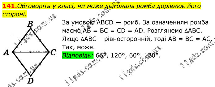 141. Обговоріть у класі, чи може діагональ ромба дорівнює його стороні. За умовою АВСD — ромб. За означенням ромба маємо АВ = ВС = СD = АD. Розглянемо ∆АВС. Якщо ∆АВС – рівносторонній, тоді АВ = ВС = АС. Так, може. Відповідь: 66°, 120°, 60°, 120°.