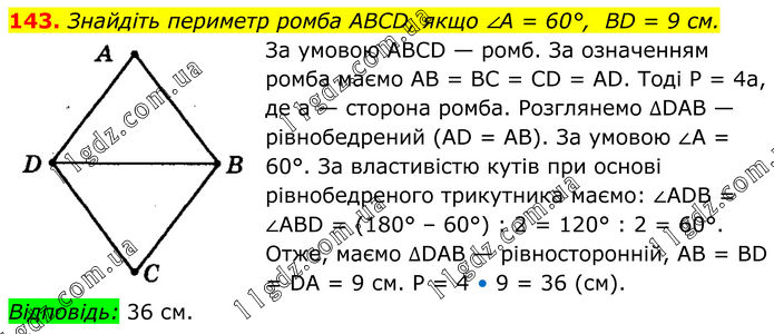 143. Знайдіть периметр ромба ABCD, якщо ∠A = 60°, BD = 9 см. За умовою ABCD — ромб. За означенням ромба маємо АВ = ВС = CD = AD. Тоді Р = 4а, де а — сторона ромба. Розглянемо ∆DAB — рівнобедрений (AD = АВ). За умовою ∠А = 60°. За властивістю кутів при основі рівнобедреного трикутника маємо: ∠ADB = ∠ABD = (180° – 60°) : 2 = 120° : 2 = 60°. Отже, маємо ∆DAB — рівносторонній, АВ = BD = DA = 9 см. Р = 4 • 9 = 36 (см). Відповідь: 36 см.