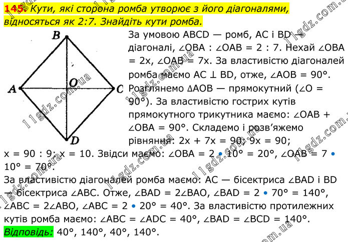 145. Кути, які сторона ромба утворює з його діагоналями, відносяться як 2:7. Знайдіть кути ромба. За умовою ABCD — ромб, АС і BD — діагоналі, ∠ОВА : ∠ОАВ = 2 : 7. Нехай ∠ОВА = 2х, ∠ОАВ = 7х. За властивістю діагоналей ромба маємо AC ⊥ BD, отже, ∠АОВ = 90°. Розглянемо ∆АОВ — прямокутний (∠О = 90°). За властивістю гострих кутів прямокутного трикутника маємо: ∠ОАВ + ∠ОВА = 90°. Складемо і розв’яжемо рівняння: 2х + 7х = 90; 9х = 90; х = 90 : 9; х = 10. Звідси маємо: ∠ОВА = 2 • 10° = 20°, ∠ОАВ = 7 • 10° = 70°. За властивістю діагоналей ромба маємо: АС — бісектриса ∠BAD і BD — бісектриса ∠АВС. Отже, ∠BAD = 2∠ВАО, ∠BAD = 2 • 70° = 140°, ∠АВС = 2∠АВО, ∠АВС = 2 • 20° = 40°. За властивістю протилежних кутів ромба маємо: ∠АВС = ∠ADC = 40°, ∠BAD = ∠BCD = 140°. Відповідь: 40°, 140°, 40°, 140°.