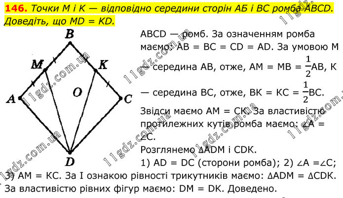 146. Точки M i K — відповідно середини сторін АБ і BC ромба ABCD. Доведіть, що MD = KD. ABCD — ромб. За означенням ромба маємо: АВ = ВС = CD = AD. За умовою М — середина АВ, отже, AM = MB = 1/2АВ, К — середина ВС, отже, ВК = КС = 1/2ВС. Звідси маємо АМ = СК. За властивістю протилежних кутів ромба маємо: ∠А = ∠С. Розглянемо ∆АDМ і CDК. 1) АD = DС (сторони ромба); 2) ∠А =∠С; 3) АМ = КС. За І ознакою рівності трикутників маємо: ∆АDМ = ∆СDК. За властивістю рівних фігур маємо: DМ = DK. Доведено.