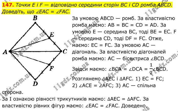 147. Точки E i F — відповідно середини сторін BC і CD ромба ABCD. Доведіть, що ∠EAC = ∠FAC. За умовою АВСD — ромб. За властивістю ромба маємо: АВ = ВС = СD = АD. За умовою Е — середина ВС, тоді ВЕ = ЕС. F — середина СD, тоді DF = FС. Отже, маємо: ЕС = FС. За умовою АС — діагональ. За властивістю діагоналей ромба маємо: АС — бісектриса ∠ВСD. Звідси маємо: ∠BCA = ∠DCA = 1/2∠BCD. Розглянемо ∆АЕС і ∆АFС. 1) ЕС = FС; 2) ∠АСЕ = ∠АFС; 3) АС — спільна сторона. За І ознакою рівності трикутників маємо: ∆АЕС = ∆AFC. За властивістю рівних фігур маємо: ∠ЕАС = ∠FАС. Доведено.