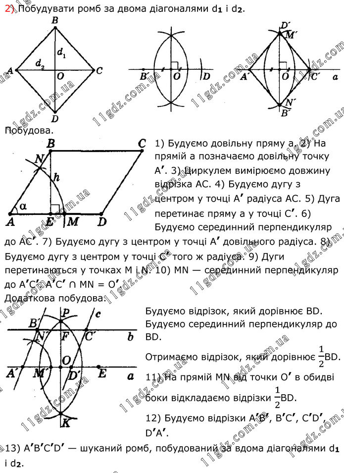 2) Побудувати ромб за двома діагоналями d1 і d2. Побудова. 1) Будуємо довільну пряму а. 2) На прямій а позначаємо довільну точку А’. 3) Циркулем вимірюємо довжину відрізка АС. 4) Будуємо дугу з центром у точці А’ радіуса АС. 5) Дуга перетинає пряму а у точці С’. 6) Будуємо серединний перпендикуляр до АС’. 7) Будуємо дугу з центром у точці А’ довільного радіуса. 8) Будуємо дугу з центром у точці С’ того ж радіуса. 9) Дуги перетинаються у точках М і N. 10) MN — серединний перпендикуляр до А’С’. А’С’ ∩ MN = O’. Додаткова побудова. Будуємо відрізок, який дорівнює ВD. Будуємо серединний перпендикуляр до ВD. Отримаємо відрізок, який дорівнює 1/2BD. 11) На прямій MN від точки О’ в обидві боки відкладаємо відрізки 1/2BD. 12) Будуємо відрізки А’В’, В’С’, C’D’, D’A’. 13) A’B’C’D’ — шуканий ромб, побудований за вдома діагоналями d1 і d2.