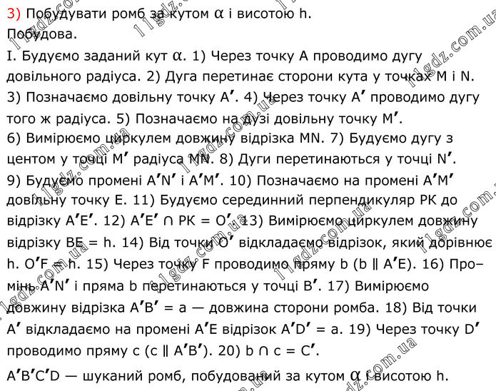 3) Побудувати ромб за кутом α і висотою h. Побудова. І. Будуємо заданий кут α. 1) Через точку А проводимо дугу довільного радіуса. 2) Дуга перетинає сторони кута у точках М і N. 3) Позначаємо довільну точку А’. 4) Через точку А’ проводимо дугу того ж радіуса. 5) Позначаємо на дузі довільну точку М’. 6) Вимірюємо циркулем довжину відрізка MN. 7) Будуємо дугу з центом у точці М’ радіуса MN. 8) Дуги перетинаються у точці N’. 9) Будуємо промені A’N’ і А’М’. 10) Позначаємо на промені А’М’ довільну точку Е. 11) Будуємо серединний перпендикуляр РК до відрізку А’Е’. 12) А’Е’ ∩ РК = O’. 13) Вимірюємо циркулем довжину відрізку ВЕ = h. 14) Від точки О’ відкладаємо відрізок, який дорівнює h. O’F = h. 15) Через точку F проводимо пряму b (b ∥ А’Е). 16) Про–мінь A’N’ і пряма b перетинаються у точці В’. 17) Вимірюємо довжину відрізка А’В’ = а — довжина сторони ромба. 18) Від точки A’ відкладаємо на промені А’Е відрізок A’D’ = а. 19) Через точку D’ проводимо пряму с (с ∥ А’В’). 20) b ∩ c = C’. A’B’C’D — шуканий ромб, побудований за кутом α і висотою h.