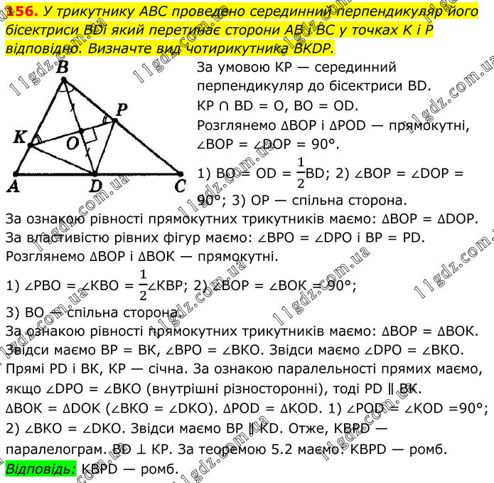 156. У трикутнику ABC проведено серединний перпендикуляр його бісектриси BDi який перетинає сторони AB і BC у точках K і P відповідно. Визначте вид чотирикутника BKDP. За умовою КР — серединний перпендикуляр до бісектриси BD. КР ∩ BD = О, BO = OD. Розглянемо ∆ВОР і ∆POD — прямокутні, ∠ВОР = ∠DOP = 90°. 1) BO = OD = 1/2BD; 2) ∠ВОР = ∠DOP = 90°; 3) OP — спільна сторона. За ознакою рівності прямокутних трикутників маємо: ∆ВОР = ∆DOP. За властивістю рівних фігур маємо: ∠ВРО = ∠DPO і BP = PD. Розглянемо ∆ВОР і ∆ВОК — прямокутні. 1) ∠РВО = ∠КВО = 1/2∠КВР; 2) ∠ВОР = ∠ВОК = 90°; 3) ВО — спільна сторона. За ознакою рівності прямокутних трикутників маємо: ∆ВОР = ∆ВОК. Звідси маємо BP = ВК, ∠ВРО = ∠ВКО. Звідси маємо ∠DРО = ∠ВКО. Прямі PD і ВК, КР — січна. За ознакою паралельності прямих маємо, якщо ∠DPO = ∠ВКО (внутрішні різносторонні), тоді PD ∥ ВК. ∆ВОК = ∆DOK (∠ВКО = ∠DKO). ∆POD = ∆KOD. 1) ∠POD = ∠KOD =90°; 2) ∠ВКО = ∠DKO. Звідси маємо ВР ∥ KD. Отже, KBPD — паралелограм. BD ⊥ КР. За теоремою 5.2 маємо: KBPD — ромб. Відповідь: KBPD — ромб.