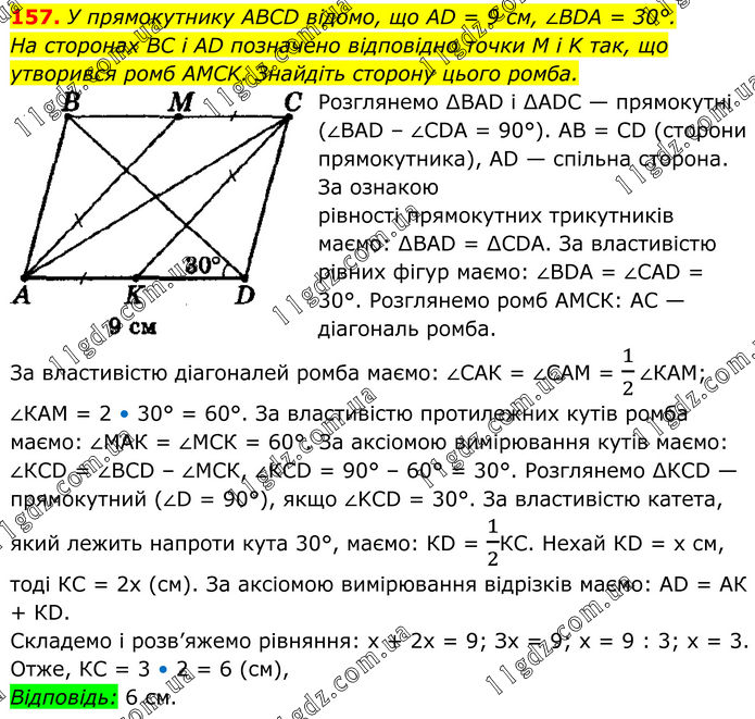 157. У прямокутнику ABCD відомо, що AD = 9 см, ∠BDA = 30°. На сторонах BC і AD позначено відповідно точки M і K так, що утворився ромб AMCK. Знайдіть сторону цього ромба. Розглянемо ∆ВАD і ∆АDС — прямокутні (∠ВАD – ∠СDА = 90°). АВ = СD (сторони прямокутника), АD — спільна сторона. За ознакою рівності прямокутних трикутників маємо: ∆ВАD = ∆СDА. За властивістю рівних фігур маємо: ∠ВDА = ∠САD = 30°. Розглянемо ромб АМСК: АС — діагональ ромба. За властивістю діагоналей ромба маємо: ∠САК = ∠САМ = 1/2∠КАМ; ∠КАМ = 2 • 30° = 60°. За властивістю протилежних кутів ромба маємо: ∠МАК = ∠МСК = 60°. За аксіомою вимірювання кутів маємо: ∠КСD = ∠ВСD – ∠МСК, ∠КСD = 90° – 60° = 30°. Розглянемо ∆КСD — прямокутний (∠D = 90°), якщо ∠KCD = 30°. За властивістю катета, який лежить напроти кута 30°, маємо: КD = 1/2КС. Нехай КD = x см, тоді КС = 2х (см). За аксіомою вимірювання відрізків маємо: АD = АК + КD. Складемо і розв’яжемо рівняння: x + 2х = 9; Зx = 9; х = 9 : 3; х = 3. Отже, КС = 3 • 2 = 6 (см), Відповідь: 6 см.