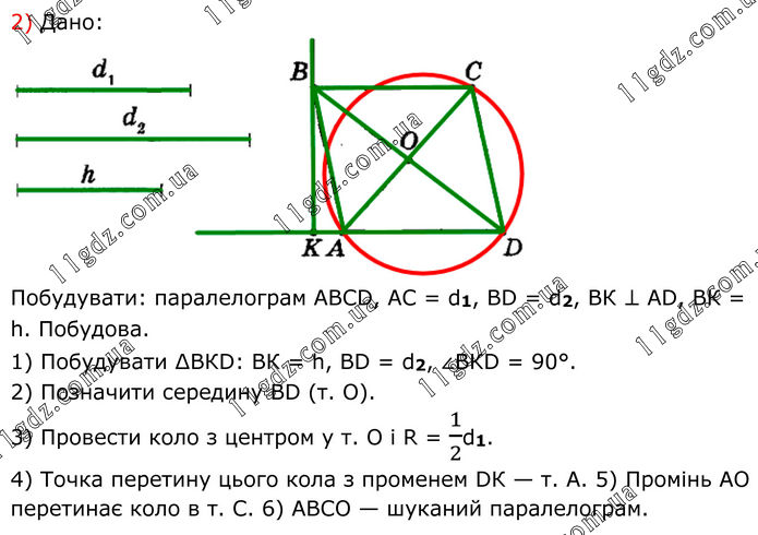 2) Дано: Побудувати: паралелограм АВСD, АС = d1, ВD = d2, ВК ⊥ АD, ВК = h. Побудова. 1) Побудувати ∆ВКD: ВК = h, ВD = d2, ∠ВКD = 90°. 2) Позначити середину ВD (т. О). 3) Провести коло з центром у т. О і R = 1/2d1. 4) Точка перетину цього кола з променем DК — т. А. 5) Промінь АО перетинає коло в т. С. 6) АВСО — шуканий паралелограм.