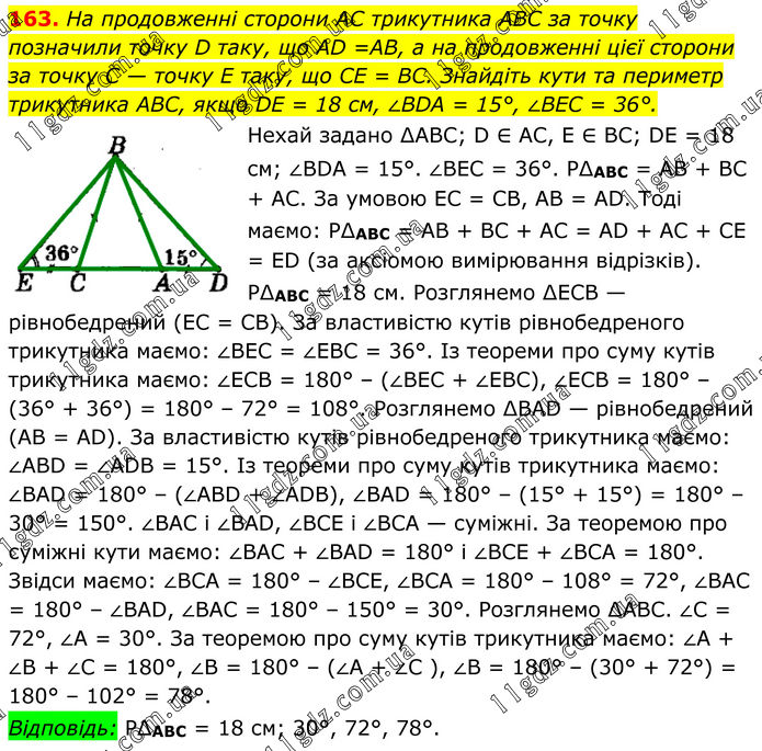 163. На продовженні сторони AC трикутника ABC за точку позначили точку D таку, що AD =AB, а на продовженні цієї сторони за точку C — точку E таку, що CE = BC. Знайдіть кути та периметр трикутника ABC, якщо DE = 18 см, ∠BDA = 15°, ∠BEC = 36°. Нехай задано ∆АВС; D ∈ АС, Е ∈ ВС; DE = 18 см; ∠ВDА = 15°. ∠ВЕС = 36°. Р∆ABC = AB + ВС + АС. За умовою ЕС = СВ, АВ = АD. Тоді маємо: Р∆ABC = АВ + ВС + АС = АD + АС + СЕ = ЕD (за аксіомою вимірювання відрізків). P∆ABC = 18 см. Розглянемо ∆ЕСВ — рівнобедрений (ЕС = СВ). За властивістю кутів рівнобедреного трикутника маємо: ∠ВЕС = ∠ЕВС = 36°. Із теореми про суму кутів трикутника маємо: ∠ЕСВ = 180° – (∠ВЕС + ∠ЕВС), ∠ЕСВ = 180° – (36° + 36°) = 180° – 72° = 108°. Розглянемо ∆ВАD — рівнобедрений (АВ = АD). За властивістю кутів рівнобедреного трикутника маємо: ∠АВD = ∠АDВ = 15°. Із теореми про суму кутів трикутника маємо: ∠ВАD = 180° – (∠АВD + ∠АDВ), ∠ВАD = 180° – (15° + 15°) = 180° – 30° = 150°. ∠ВАС і ∠ВАD, ∠ВСЕ і ∠ВСА — суміжні. За теоремою про суміжні кути маємо: ∠ВАС + ∠ВАD = 180° і ∠ВСЕ + ∠ВСА = 180°. Звідси маємо: ∠ВСА = 180° – ∠ВСЕ, ∠ВСА = 180° – 108° = 72°, ∠ВАС = 180° – ∠ВАD, ∠ВАС = 180° – 150° = 30°. Розглянемо ∆АВС. ∠С = 72°, ∠А = 30°. За теоремою про суму кутів трикутника маємо: ∠А + ∠В + ∠С = 180°, ∠В = 180° – (∠А + ∠С ), ∠В = 180° – (30° + 72°) = 180° – 102° = 78°. Відповідь: Р∆ABC = 18 см; 30°, 72°, 78°.