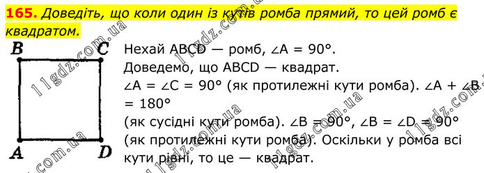 165. Доведіть, що коли один із кутів ромба прямий, то цей ромб є квадратом. Нехай АВСD — ромб, ∠А = 90°. Доведемо, що АВСD — квадрат. ∠А = ∠С = 90° (як протилежні кути ромба). ∠А + ∠В = 180° (як сусідні кути ромба). ∠B = 90°, ∠В = ∠D = 90° (як протилежні кути ромба). Оскільки у ромба всі кути рівні, то це — квадрат.
