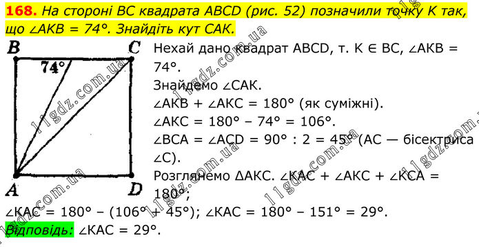 168. На стороні BC квадрата ABCD (рис. 52) позначили точку K так, що ∠AKB = 74°. Знайдіть кут САК. Нехай дано квадрат АВСD, т. K ∈ ВС, ∠АКВ = 74°. Знайдемо ∠САК. ∠АКВ + ∠АКС = 180° (як суміжні). ∠АКС = 180° – 74° = 106°. ∠ВСА = ∠АСD = 90° : 2 = 45° (АС — бісектриса ∠С). Розглянемо ∆АКС. ∠КАС + ∠АКС + ∠KСА = 180°; ∠КАС = 180° – (106° + 45°); ∠КАС = 180° – 151° = 29°. Відповідь: ∠КАС = 29°.
