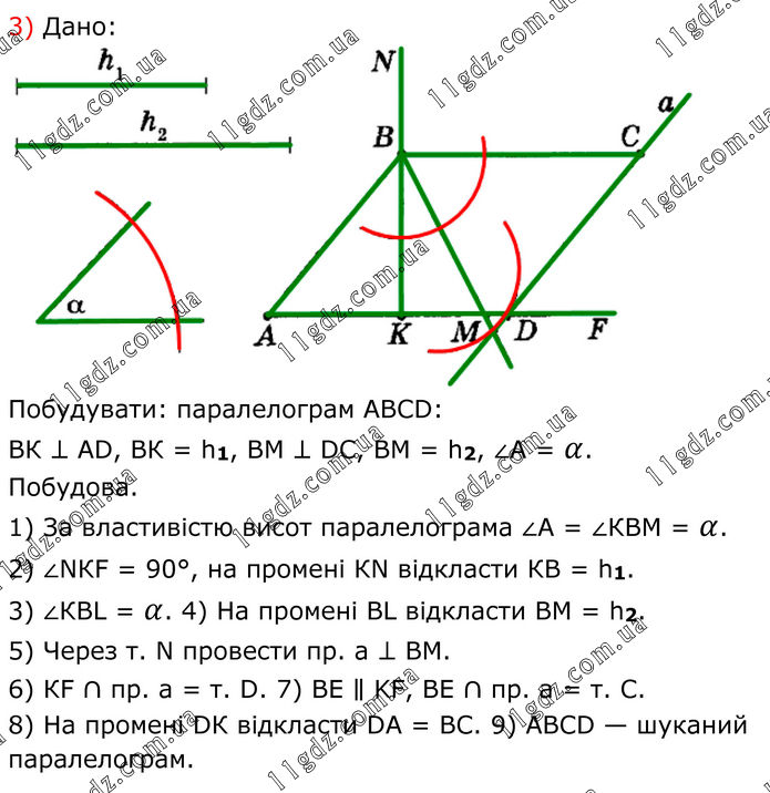3) Дано: Побудувати: паралелограм АВСD: ВК ⊥ АD, ВК = h1, ВМ ⊥ DС, ВМ = h2, ∠А = α. Побудова. 1) За властивістю висот паралелограма ∠А = ∠КВМ = α. 2) ∠NКF = 90°, на промені КN відкласти КВ = h1. 3) ∠КВL = α. 4) На промені ВL відкласти ВМ = h2. 5) Через т. N провести пр. а ⊥ ВМ. 6) КF ∩ пр. а = т. D. 7) ВЕ ∥ KF, ВЕ ∩ пр. а = т. С. 8) На промені DК відкласти DА = ВС. 9) АВСD — шуканий паралелограм.