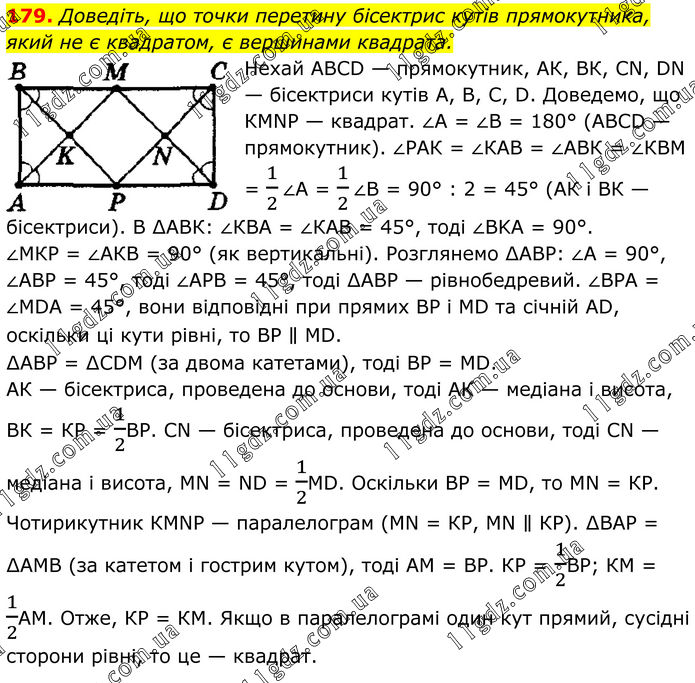 179. Доведіть, що точки перетину бісектрис кутів прямокутника, який не є квадратом, є вершинами квадрата. Нехай АВСD — прямокутник, АК, ВК, СN, DN — бісектриси кутів А, В, С, D. Доведемо, що КМNР — квадрат. ∠А = ∠В = 180° (AВСD — прямокутник). ∠РАК = ∠КАВ = ∠АВК = ∠КВМ = 1/2∠А = 1/2∠В = 90° : 2 = 45° (АК і ВК — бісектриси). В ∆АВК: ∠КВА = ∠КАВ = 45°, тоді ∠ВKА = 90°. ∠МКР = ∠АКВ = 90° (як вертикальні). Розглянемо ∆АВР: ∠А = 90°, ∠АВР = 45°, тоді ∠АРВ = 45°, тоді ∆АВР — рівнобедревий. ∠ВРА = ∠МDА = 45°, вони відповідні при прямих ВР і МD та січній АD, оскільки ці кути рівні, то ВР ∥ МD. ∆АВР = ∆СDМ (за двома катетами), тоді ВР = МD. АК — бісектриса, проведена до основи, тоді АК — медіана і висота, ВК = КР = 1/2ВР. СN — бісектриса, проведена до основи, тоді СN — медіана і висота, МN = ND = 1/2МD. Оскільки ВР = МD, то МN = КР. Чотирикутник КМNР — паралелограм (МN = КР, МN ∥ КР). ∆ВАР = ∆АМВ (за катетом і гострим кутом), тоді АМ = ВР. КР = 1/2ВР; КМ = 1/2АМ. Отже, КР = КМ. Якщо в паралелограмі один кут прямий, сусідні сторони рівні, то це — квадрат.