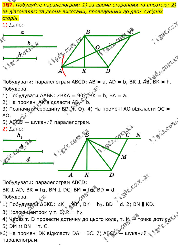 107. Побудуйте паралелограм: 1) за двома сторонами та висотою; 2) за діагоналлю та двома висотами, проведеними до двох сусідніх сторін. 1) Дано: Побудувати: паралелограм АВСD: АВ = а, АD = b, ВК ⊥ АВ, ВК = h. Побудова. 1) Побудувати ∆АВК: ∠ВКА = 90°, ВК = h, ВА = а. 2) На промені АК відкласти АD = b. 3) Позначити середину ВD (т. О). 4) На промені АО відкласти ОС = AO. 5) АВСD — шуканий паралелограм. 2) Дано: Побудувати: паралелограм АВСD: ВК ⊥ АD, ВК = h1, ВМ ⊥ DC, ВМ = h2, ВD = d. Побудова. 1) Побудувати ∆ВКD: ∠К = 90°, ВК = h1, ВD = d. 2) ВN ∥ КD. 3) Коло з центром у т. В, R = h2. 4) Через т. D провести дотичну до цього кола, т. M — точка дотику. 5) DМ ∩ ВN = т. С. 6) На промені DК відкласти DА = ВС. 7) АВСD — шуканий паралелограм.