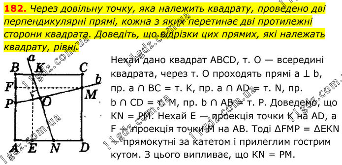 182. Через довільну точку, яка належить квадрату, проведено дві перпендикулярні прямі, кожна з яких перетинає дві протилежні сторони квадрата. Доведіть, що відрізки цих прямих, які належать квадрату, рівні. Нехай дано квадрат АВСD, т. О — всередині квадрата, через т. O проходять прямі а ⊥ b, пр. а ∩ ВС = т. K, пр. а ∩ АD = т. N, пр. b ∩ СD = т. М, пр. b ∩ АВ = т. Р. Доведемо, що КN = РМ. Нехай E — проекція точки K на АD, а F — проекція точки M на АВ. Тоді ∆FМР = ∆ЕКN — прямокутні за катетом і прилеглим гострим кутом. З цього випливає, що КN = РМ.