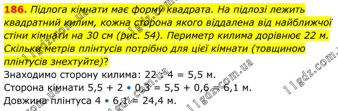 186. Підлога кімнати має форму квадрата. На підлозі лежить квадратний килим, кожна сторона якого віддалена від найближчої стіни кімнати на 30 см (рис. 54). Периметр килима дорівнює 22 м. Скільки метрів плінтусів потрібно для цієї кімнати (товщиною плінтусів знехтуйте)? Знаходимо сторону килима: 22 : 4 = 5,5 м. Сторона кімнати 5,5 + 2 • 0,3 = 5,5 + 0,6 = 6,1 м. Довжина плінтуса 4 • 6,1 = 24,4 м.