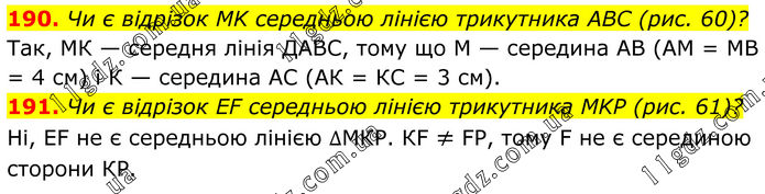 190. Чи є відрізок MK середньою лінією трикутника ABC (рис. 60)? Так, МК — середня лінія ДАВС, тому що М — середина АВ (АМ = МВ = 4 см) і К — середина АС (АК = КС = 3 см). 191. Чи є відрізок EF середньою лінією трикутника MKP (рис. 61)? Ні, ЕF не є середньою лінією ∆МКР. КF ≠ FР, тому F не є серединою сторони КР.
