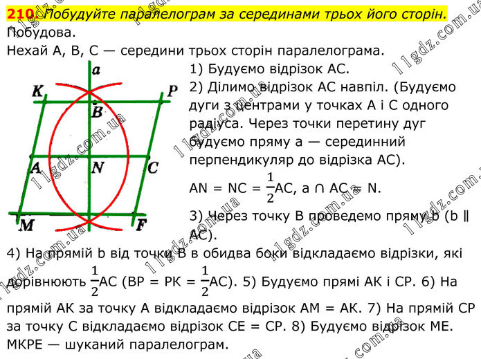 210. Побудуйте паралелограм за серединами трьох його сторін. Побудова. Нехай А, В, С — середини трьох сторін паралелограма. 1) Будуємо відрізок АС. 2) Ділимо відрізок АС навпіл. (Будуємо дуги з центрами у точках А і С одного радіуса. Через точки перетину дуг будуємо пряму а — серединний перпендикуляр до відрізка АС). АN = NС = 1/2АС, a ∩ АС = N. 3) Через точку В проведемо пряму b (b ∥ АС). 4) На прямій b від точки В в обидва боки відкладаємо відрізки, які дорівнюють 1/2АС (ВР = РК = 1/2АС). 5) Будуємо прямі АК і СР. 6) На прямій АК за точку А відкладаємо відрізок АМ = АК. 7) На прямій СР за точку С відкладаємо відрізок СЕ = СР. 8) Будуємо відрізок МЕ. МКРЕ — шуканий паралелограм.