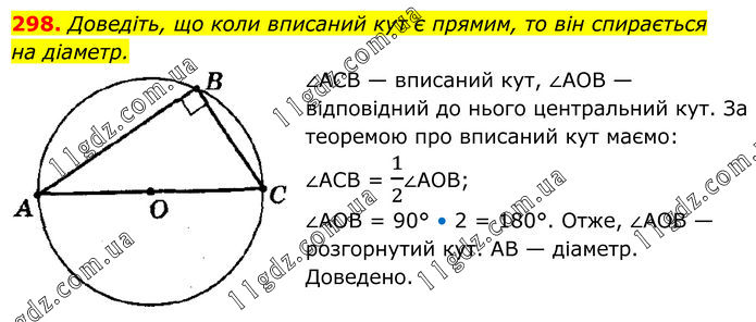 298. Доведіть, що коли вписаний кут є прямим, то він спирається на діаметр. ∠ACB — вписаний кут, ∠AOB — відповідний до нього центральний кут. За теоремою про вписаний кут маємо: ∠ACB = 1/2∠АОВ; ∠АОВ = 90° • 2 = 180°. Отже, ∠АОВ — розгорнутий кут. АВ — діаметр. Доведено.