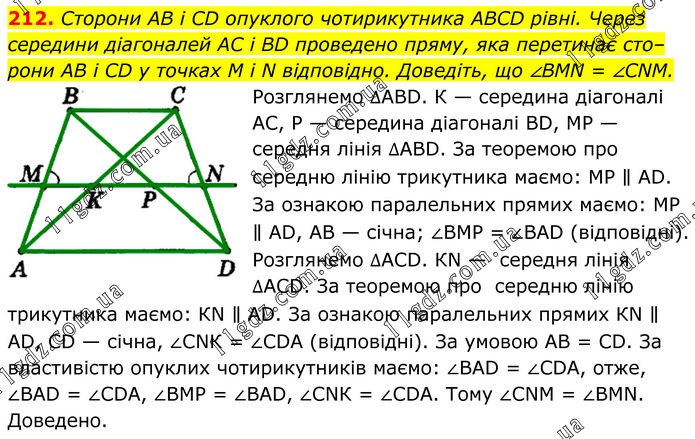 212. Сторони AB і CD опуклого чотирикутника ABCD рівні. Через середини діагоналей AC і BD проведено пряму, яка перетинає сто–рони AB і CD у точках M і N відповідно. Доведіть, що ∠BMN = ∠CNM. Розглянемо ∆АВD. К — середина діагоналі АС, Р — середина діагоналі ВD, МР — середня лінія ∆АВD. За теоремою про середню лінію трикутника маємо: МР ∥ АD. За ознакою паралельних прямих маємо: МР ∥ АD, АВ — січна; ∠ВМР = ∠ВАD (відповідні). Розглянемо ∆АСD. КN — середня лінія ∆АСD. За теоремою про середню лінію трикутника маємо: КN ∥ АD. За ознакою паралельних прямих КN ∥ АD, СD — січна, ∠СNК = ∠СDА (відповідні). За умовою АВ = СD. За властивістю опуклих чотирикутників маємо: ∠ВАD = ∠СDА, отже, ∠ВАD = ∠СDА, ∠ВМР = ∠ВАD, ∠СNК = ∠СDА. Тому ∠СNМ = ∠ВМN. Доведено.