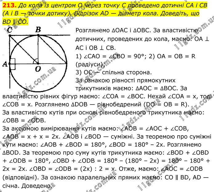 213. До кола із центром O через точку C проведено дотичні CA і CB (А і В — точки дотику). Відрізок AD — діаметр кола. Доведіть, що BD ∥ CO. Розглянемо ∆OАС і ∆OВС. За властивістю дотичних, проведених до кола, маємо: ОА ⊥ АС і ОВ ⊥ СВ. 1) ∠САО = ∠СВО = 90°; 2) ОА = ОВ = R (радіуси); 3) ОС — спільна сторона. За ознакою рівності прямокутних трикутників маємо: ∆АОС = ∆ВОС. За властивістю рівних фігур маємо: ∠СОА = ∠ВОС. Нехай ∠СОА = х, тоді ∠СОВ = х. Розглянемо ∆DОВ — рівнобедрений (DO = ОВ = R). За властивістю кутів при основі рівнобедреного трикутника маємо: ∠ОВВ = ∠ОDВ. За аксіомою вимірювання кутів маємо: ∠АОВ = ∠АОС + ∠СОВ, ∠АОВ = х + х = 2х. ∠АОВ і ∠BOD — суміжні. За теоремою про суміжні кути маємо: ∠АОВ + ∠BOD = 180°, ∠BOD = 180° – 2х. Розглянемо ∆BOD. За теоремою про суму кутів трикутника маємо: ∠BOD + ∠OBD + ∠ODB = 180°, ∠OBD + ∠ODB = 180° – (180° – 2х) = 180° – 180° + 2х = 2х. ∠OBD = ∠ODB = (2х) : 2 = х. Отже, маємо: ∠АОС = ∠ODB (відповідні). За ознакою паралельних прямих маємо: СО ∥ BD, AD — січна. Доведено.