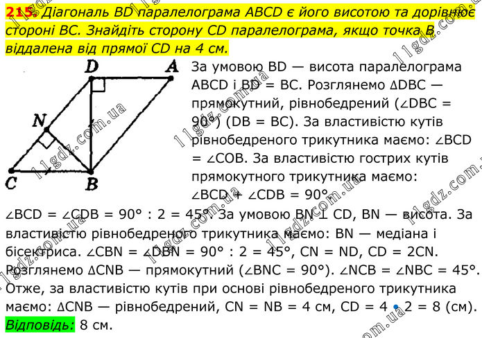 215. Діагональ BD паралелограма ABCD є його висотою та дорівнює стороні BC. Знайдіть сторону CD паралелограма, якщо точка В віддалена від прямої CD на 4 см. За умовою BD — висота паралелограма ABCD і BD = ВС. Розглянемо ∆DBC — прямокутний, рівнобедрений (∠DBC = 90°) (DB = ВС). За властивістю кутів рівнобедреного трикутника маємо: ∠BCD = ∠СОВ. За властивістю гострих кутів прямокутного трикутника маємо: ∠BCD + ∠CDB = 90°. ∠BCD = ∠CDB = 90° : 2 = 45°. За умовою BN ⊥ CD, BN — висота. За властивістю рівнобедреного трикутника маємо: BN — медіана і бісектриса. ∠CBN = ∠DBN = 90° : 2 = 45°, CN = ND, CD = 2CN. Розглянемо ∆CNB — прямокутний (∠BNC = 90°). ∠NCB = ∠NBC = 45°. Отже, за властивістю кутів при основі рівнобедреного трикутника маємо: ∆CNB — рівнобедрений, СN = NB = 4 см, CD = 4 • 2 = 8 (см). Відповідь: 8 см.