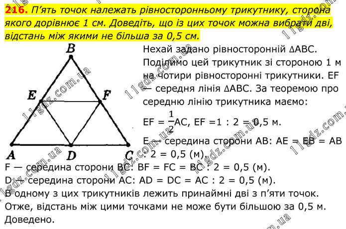 216. П’ять точок належать рівносторонньому трикутнику, сторона якого дорівнює 1 см. Доведіть, що із цих точок можна вибрати дві, відстань між якими не більша за 0,5 см. Нехай задано рівносторонній ∆ABC. Поділимо цей трикутник зі стороною 1 м на чотири рівносторонні трикутники. EF — середня лінія ∆ABC. За теоремою про середню лінію трикутника маємо: EF = 1/2AC, EF =1 : 2 = 0,5 м. Е — середина сторони АВ: АЕ = ЕВ = АВ : 2 = 0,5 (м). F — середина сторони ВС: BF = FC = ВС : 2 = 0,5 (м). D — середина сторони АС: AD = DC = АС : 2 = 0,5 (м). В одному з цих трикутників лежить принаймні дві з п’яти точок. Отже, відстань між цими точками не може бути більшою за 0,5 м. Доведено.