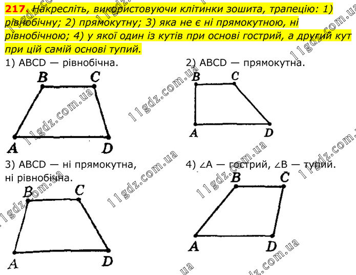 217. Накресліть, використовуючи клітинки зошита, трапецію: 1) рівнобічну; 2) прямокутну; 3) яка не є ні прямокутною, ні рівнобічною; 4) у якої один із кутів при основі гострий, а другий кут при цій самій основі тупий. 1) ABCD — рівнобічна. 2) ABCD — прямокутна. 3) АВСD — ні прямокутна, ні рівнобічна. 4) ∠А — гострий, ∠В — тупий.
