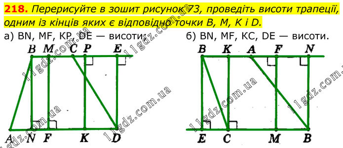 218. Перерисуйте в зошит рисунок 73, проведіть висоти трапеції, одним із кінців яких є відповідно точки B, M, K i D. а) ВN, МF, КР, DЕ — висоти; б) ВN, МF, КС, DЕ — висоти.