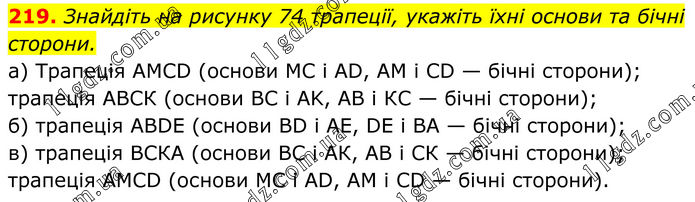219. Знайдіть на рисунку 74 трапеції, укажіть їхні основи та бічні сторони. а) Трапеція АМСD (основи МС і АD, АМ і СD — бічні сторони); трапеція АВСК (основи ВС і АK, АВ і КС — бічні сторони); б) трапеція АВDЕ (основи ВD і АЕ, DЕ і ВА — бічні сторони); в) трапеція ВСКА (основи ВС і АК, АВ і СК — бічні сторони); трапеція АМСD (основи МС і АD, АМ і СD — бічні сторони).